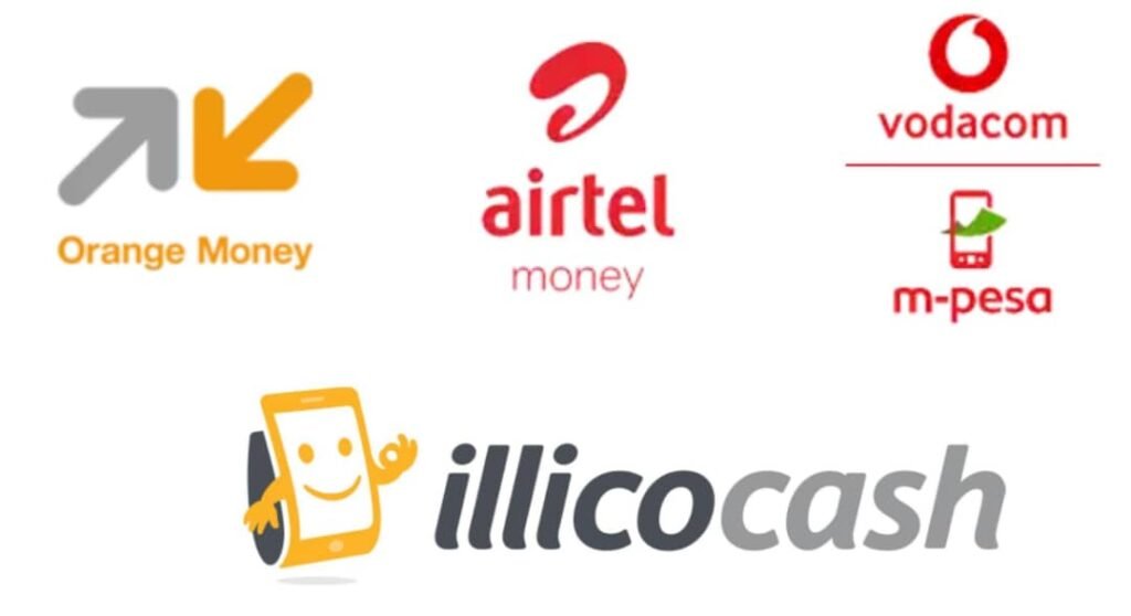 (MPESA, Airtel Money, Orange Money, Visa, Mastercard, illicocash…)
